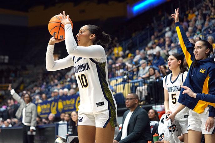 Cal Bears guard Lulu Twidale hit seven three-pointers as the Bears (18-13, 9-9 in the ACC) won their final home game of the season, 78-34, against the SMU Mustangs (9-21, 2-16 ACC) on Sunday, March 1st at Haas Pavilion. Caption and photo
